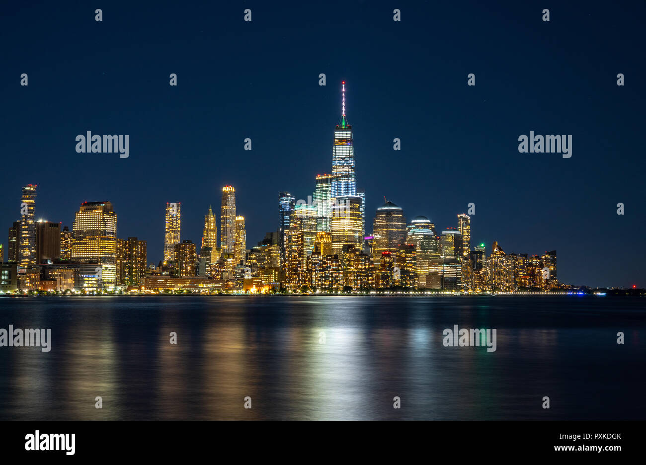 Aerial stock photo of freedom tower rising over lower manhattan at night with downtown jersey city in the background.