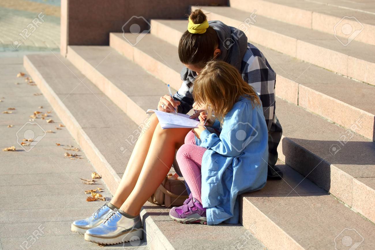 The Woman With The Little Girl Drawing In A Notebook While Sitting | Get Image Full HD