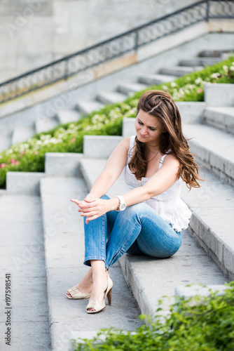 Photo sad teenage girl sitting alone on the stairs can be used for personal and commercial purposes according to the conditions of the purchased royalty free license.